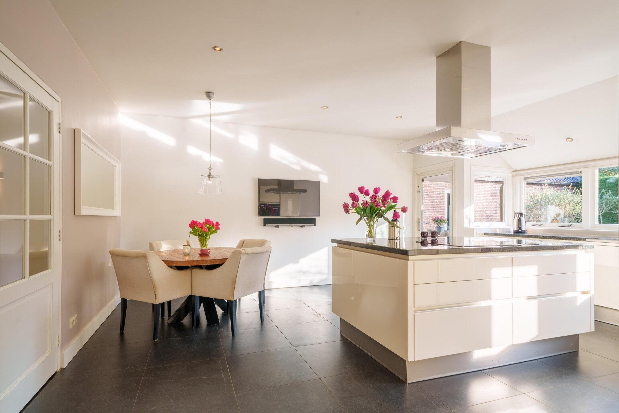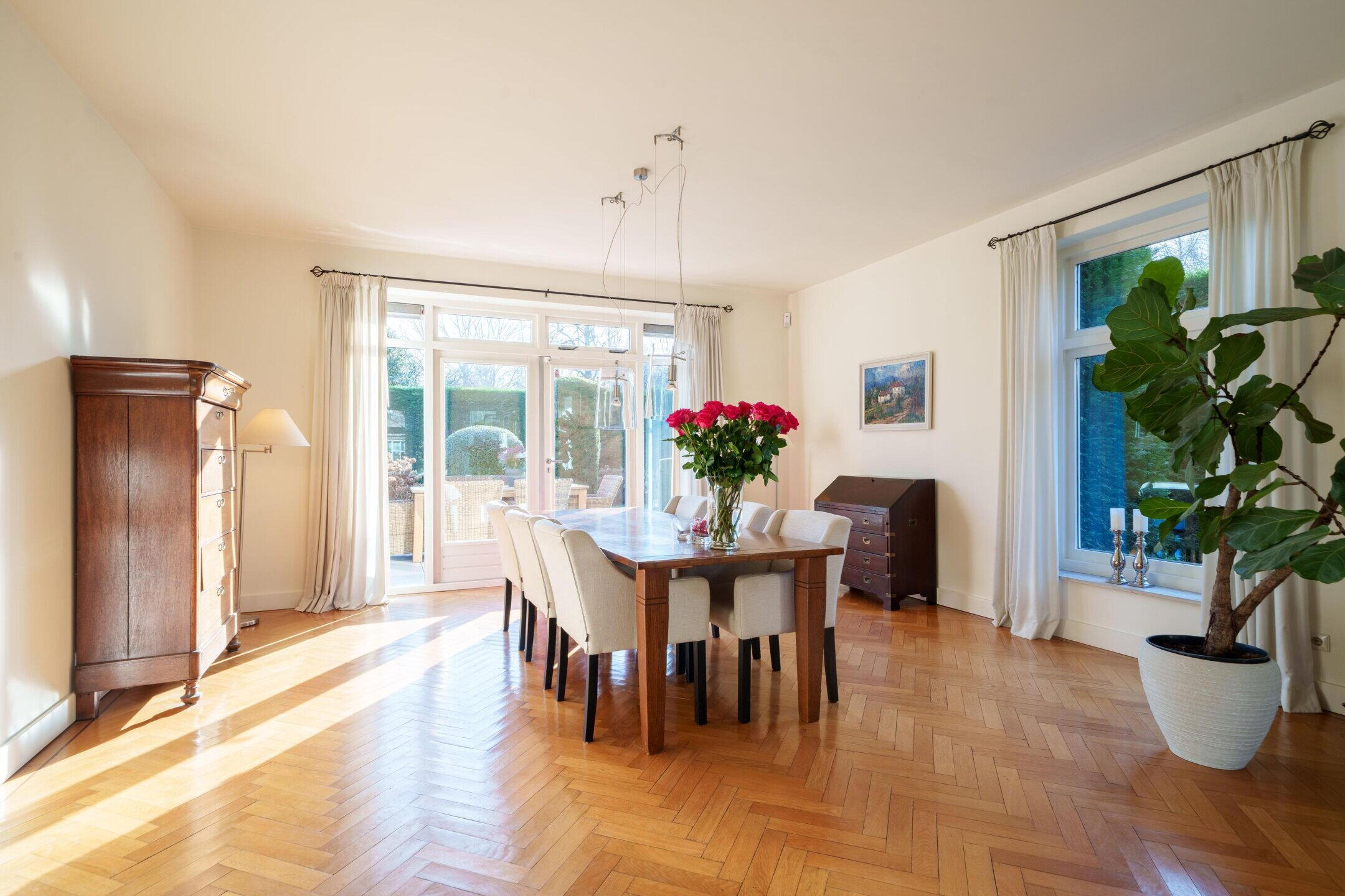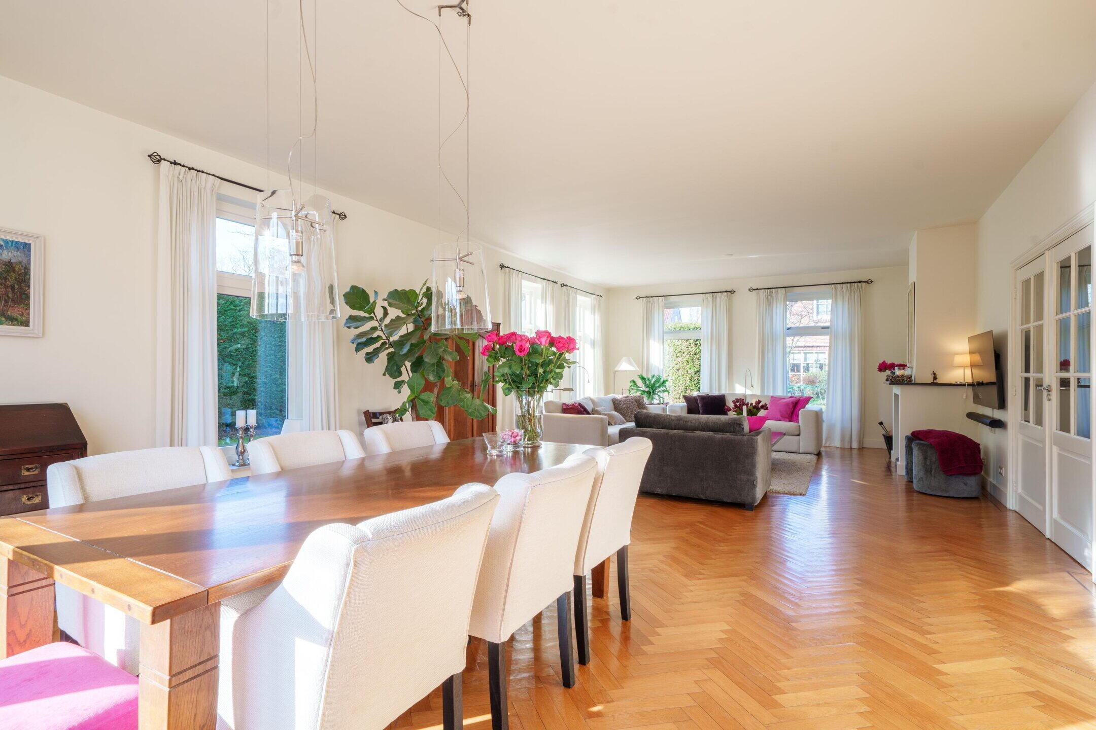 Via de dubbele voordeur kom je in de royale entreehal van de woning. Deze hal voelt verrassend ruim aan en biedt via drie dubbele deuren toegang tot de verschillende leefruimtes.