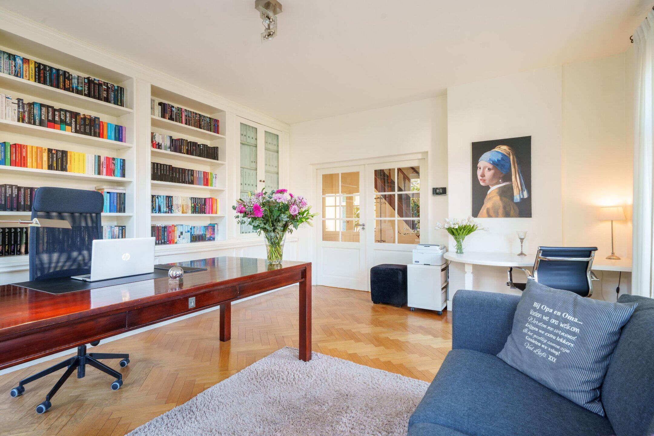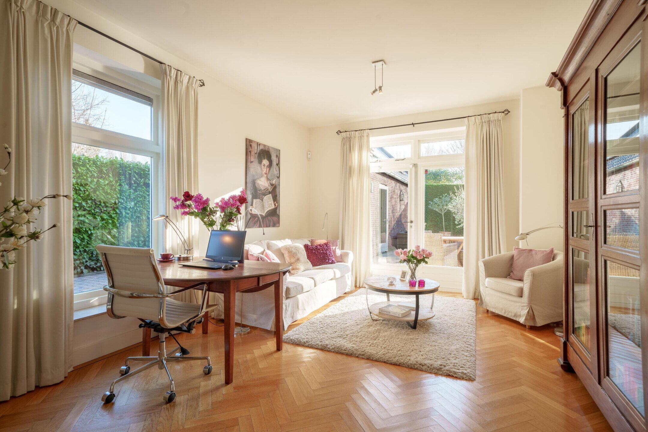 Aan de voorzijde van het huis bevindt zich, direct naast de entreehal, een ruime werkkamer, ideaal voor thuiswerken of bijvoorbeeld een bibliotheek. De riante woonkamer is licht en voorzien van een sfeervolle haard en dubbele openslaande deuren naar de achtertuin. Aan de achterzijde van de woning is een tweede werkkamer gesitueerd, eveneens perfect als kantoor-, hobby- of praktijkruimte. Vanuit deze kamer heb je via openslaande deuren eveneens toegang tot de achtertuin.