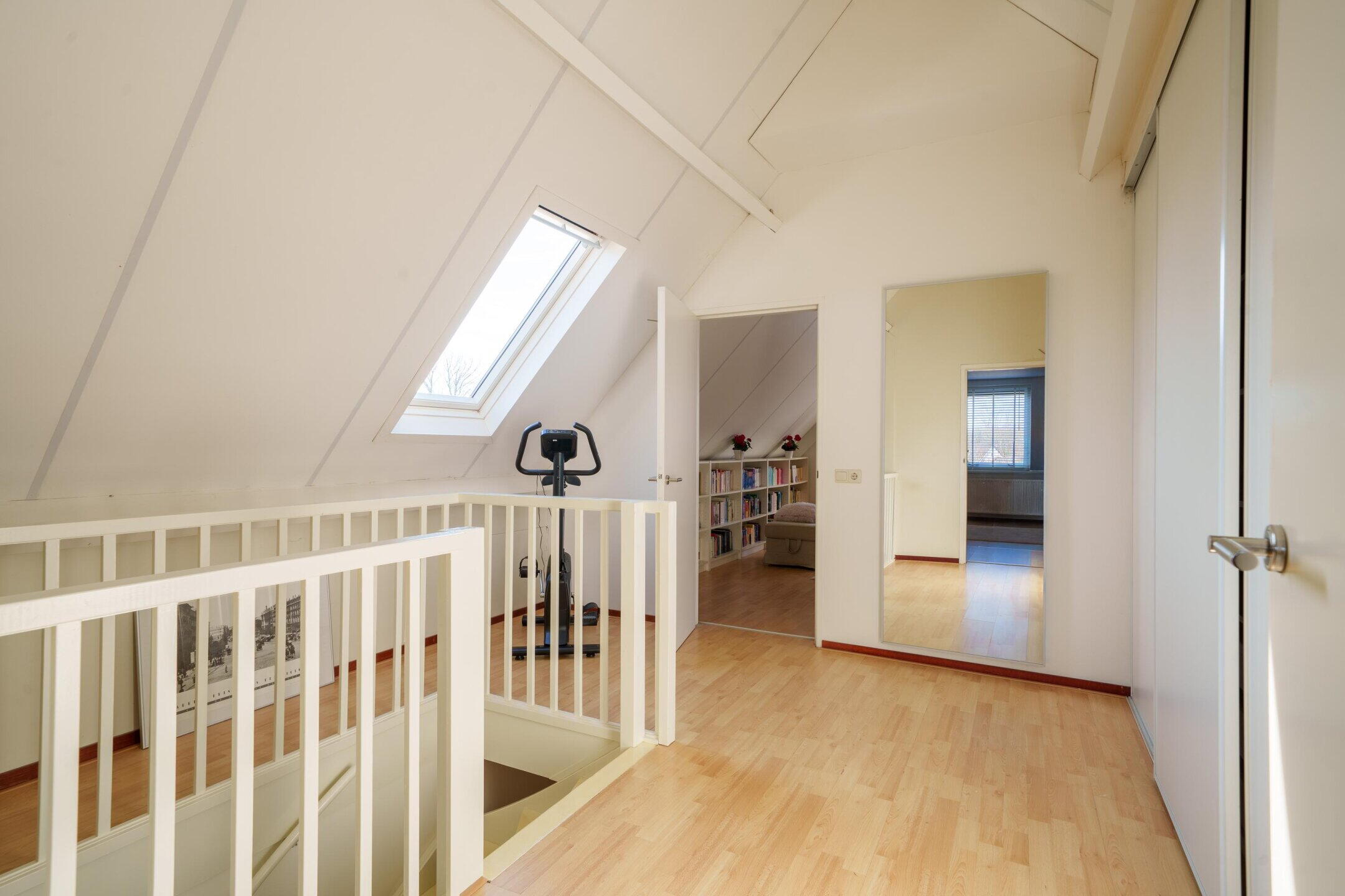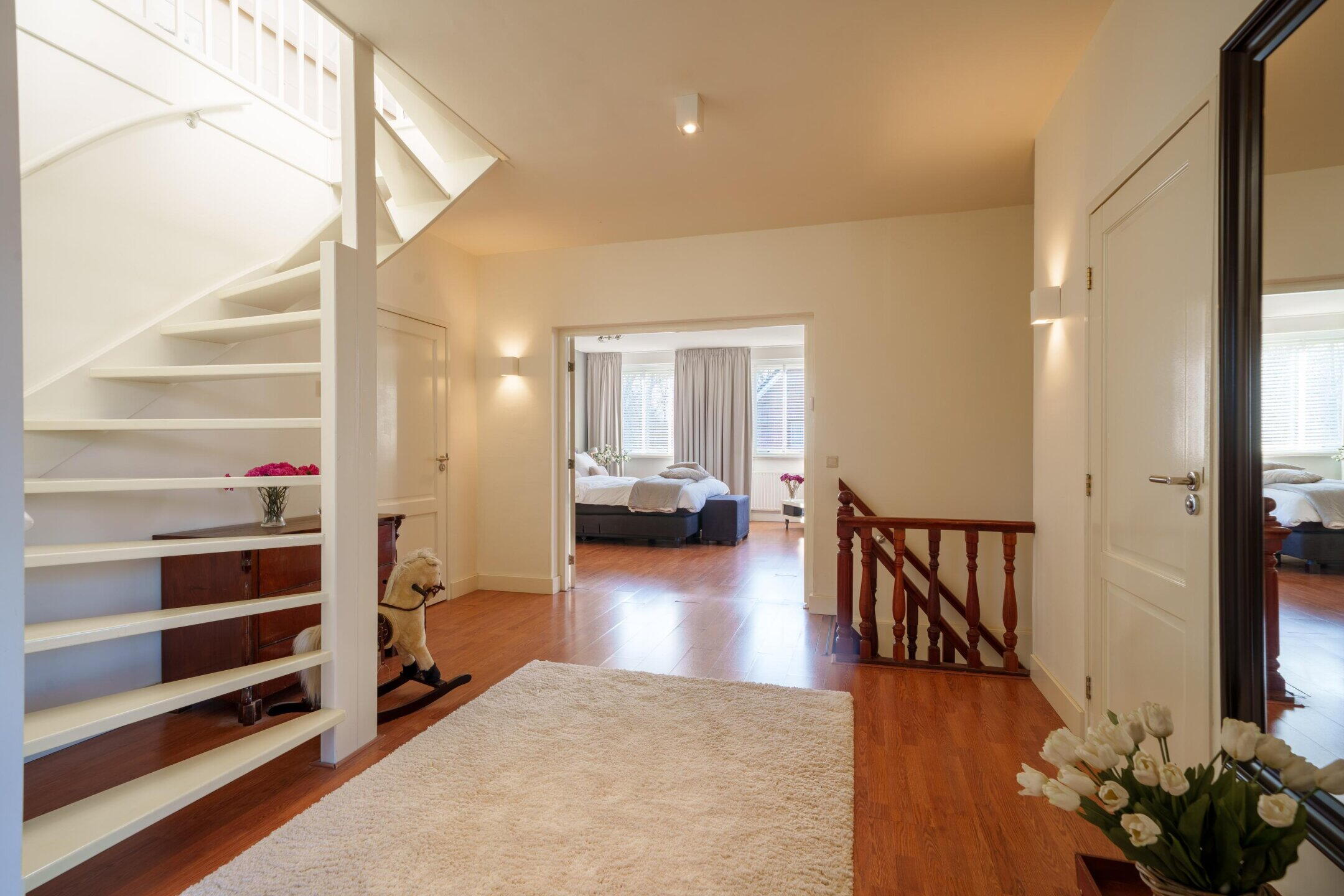 Via een open trap kom je op de overloop van de tweede verdieping.