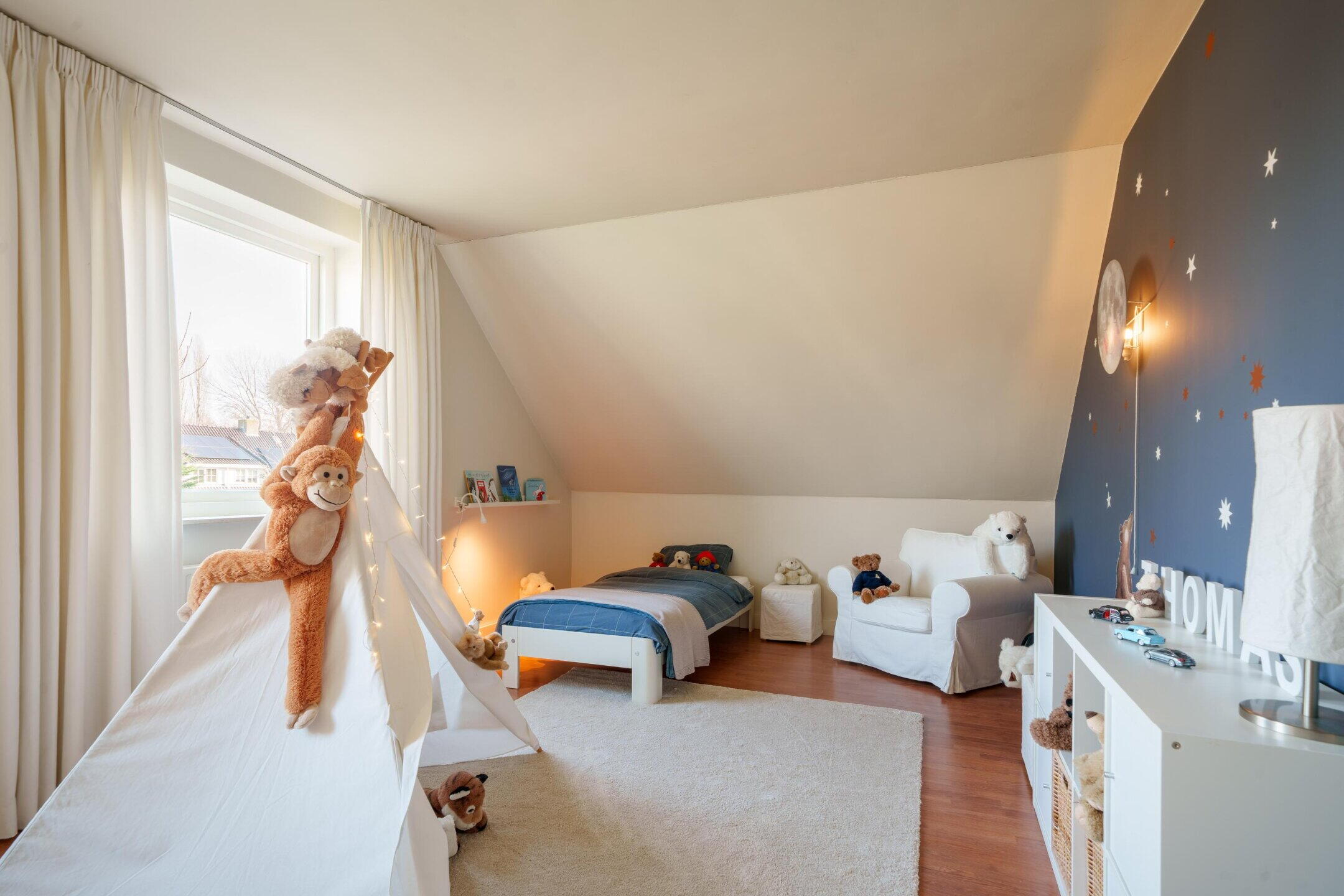 De andere twee slaapkamers zijn eveneens royaal, met voldoende ruimte voor een tweepersoonsbed en kasten. De grote ramen zorgen voor veel licht.