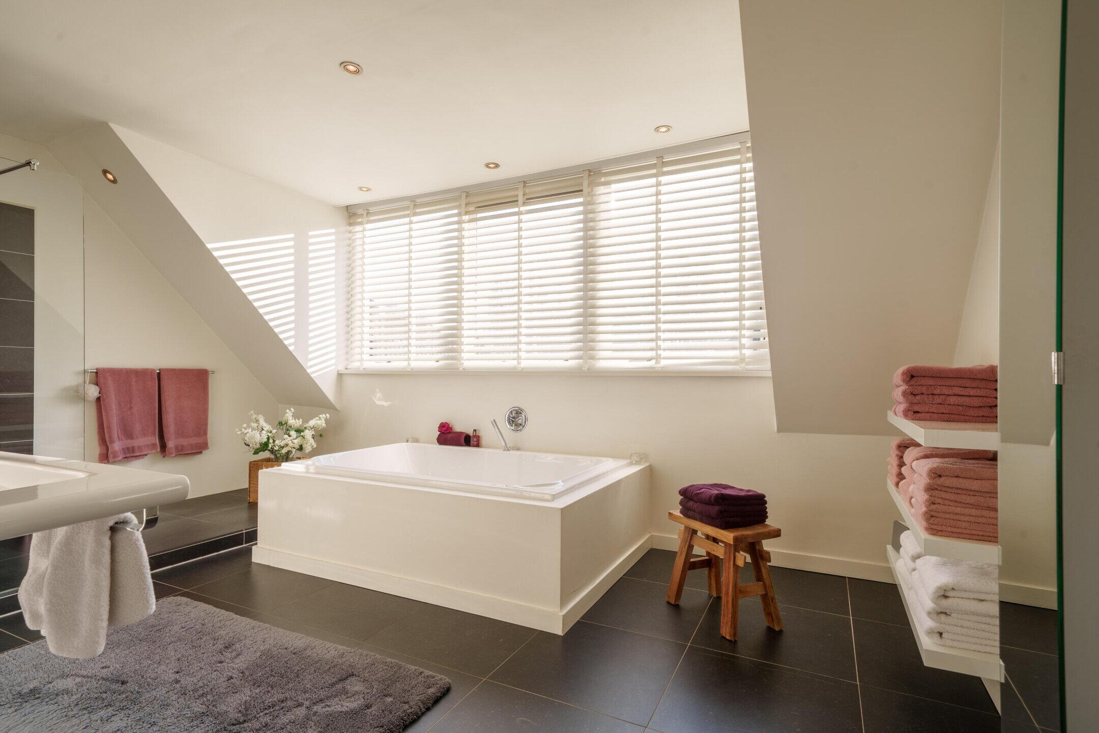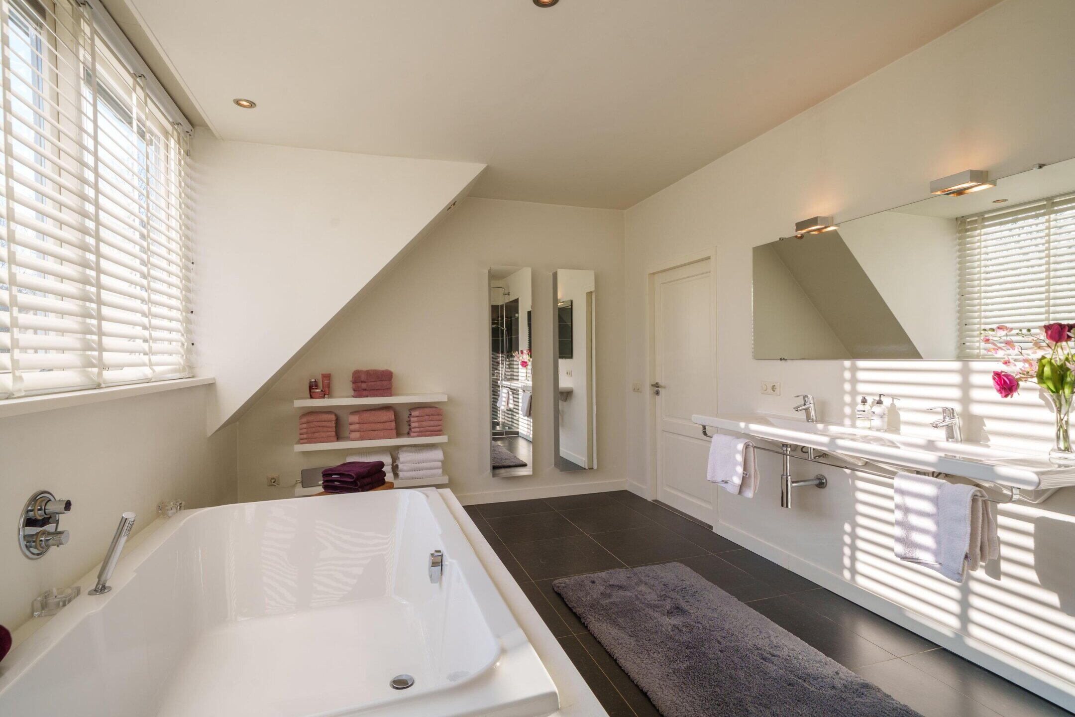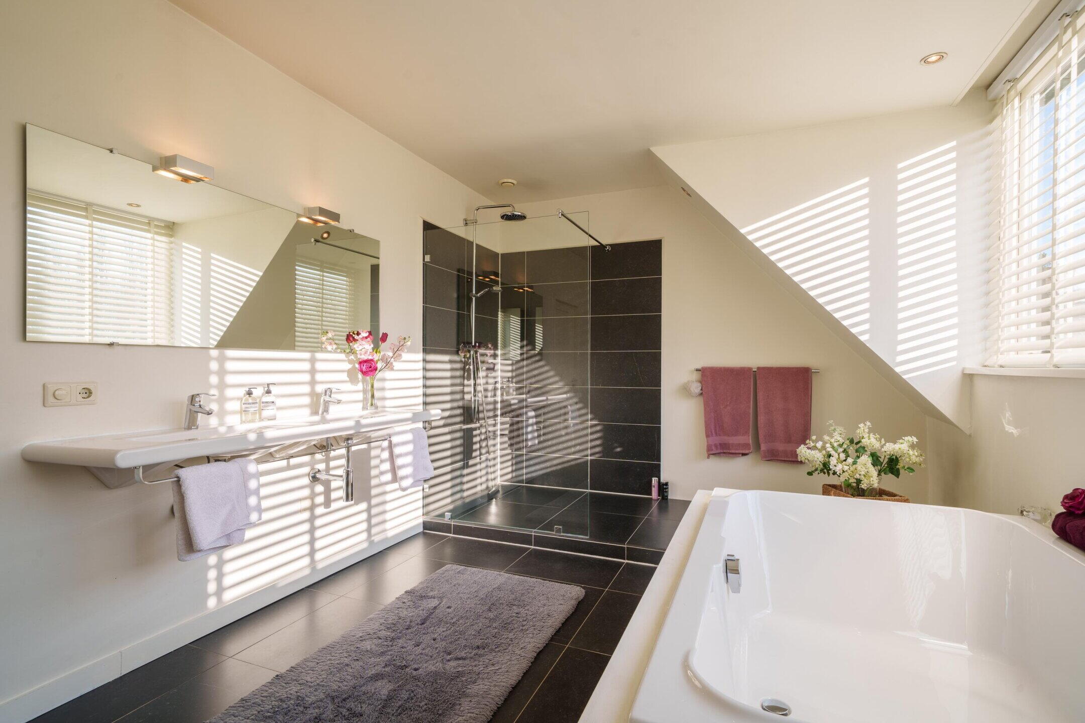 De aangrenzende hoofdbadkamer is luxe uitgevoerd met een dubbel ligbad, inloopdouche en een dubbele wastafel. Mede dankzij de grote dakkapel is deze badkamer zeer ruim en licht.