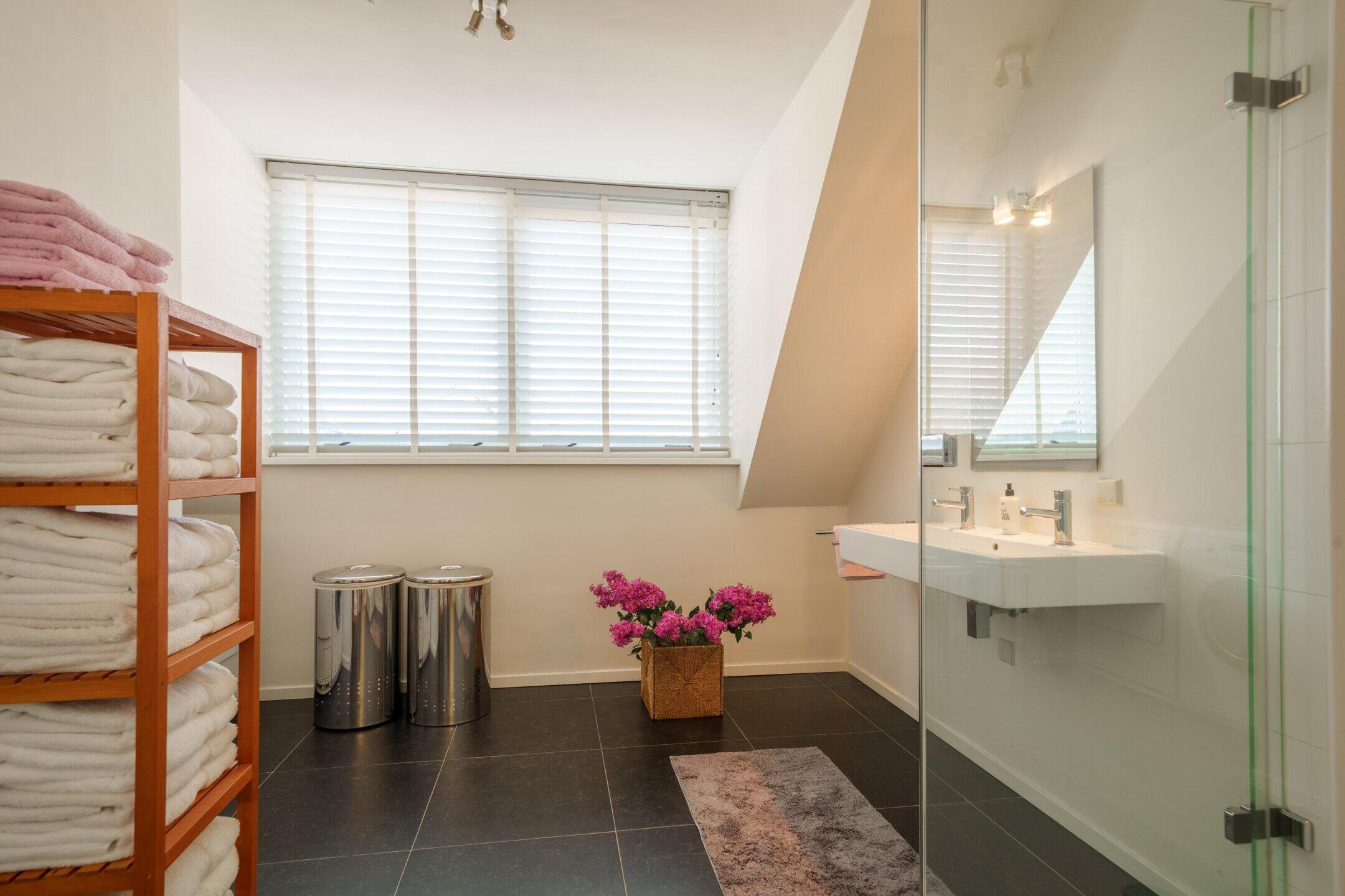 - Douche, dubbele wastafel, wasmachineaansluiting ligbad, inloopdouche