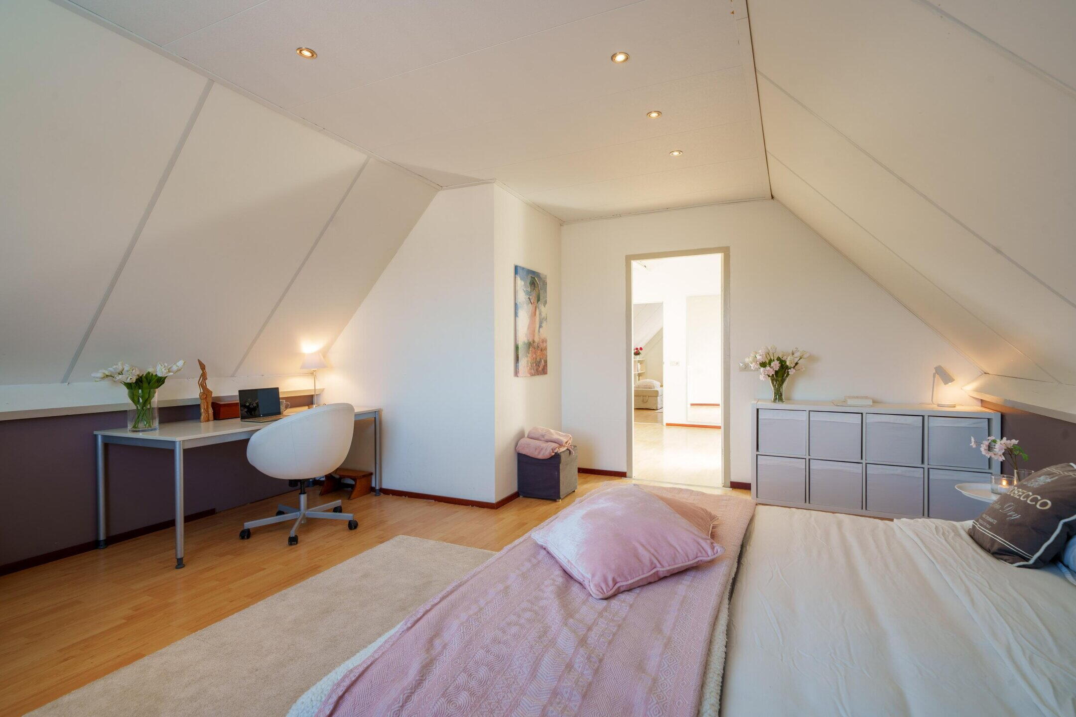 Ook hier tref je een royale overloop met vaste kastenwand en de opstelling van de cv-ketel. Daarnaast zijn er twee ruime kamers, ideaal als slaap-, werk- of logeerkamer te gebruiken.
