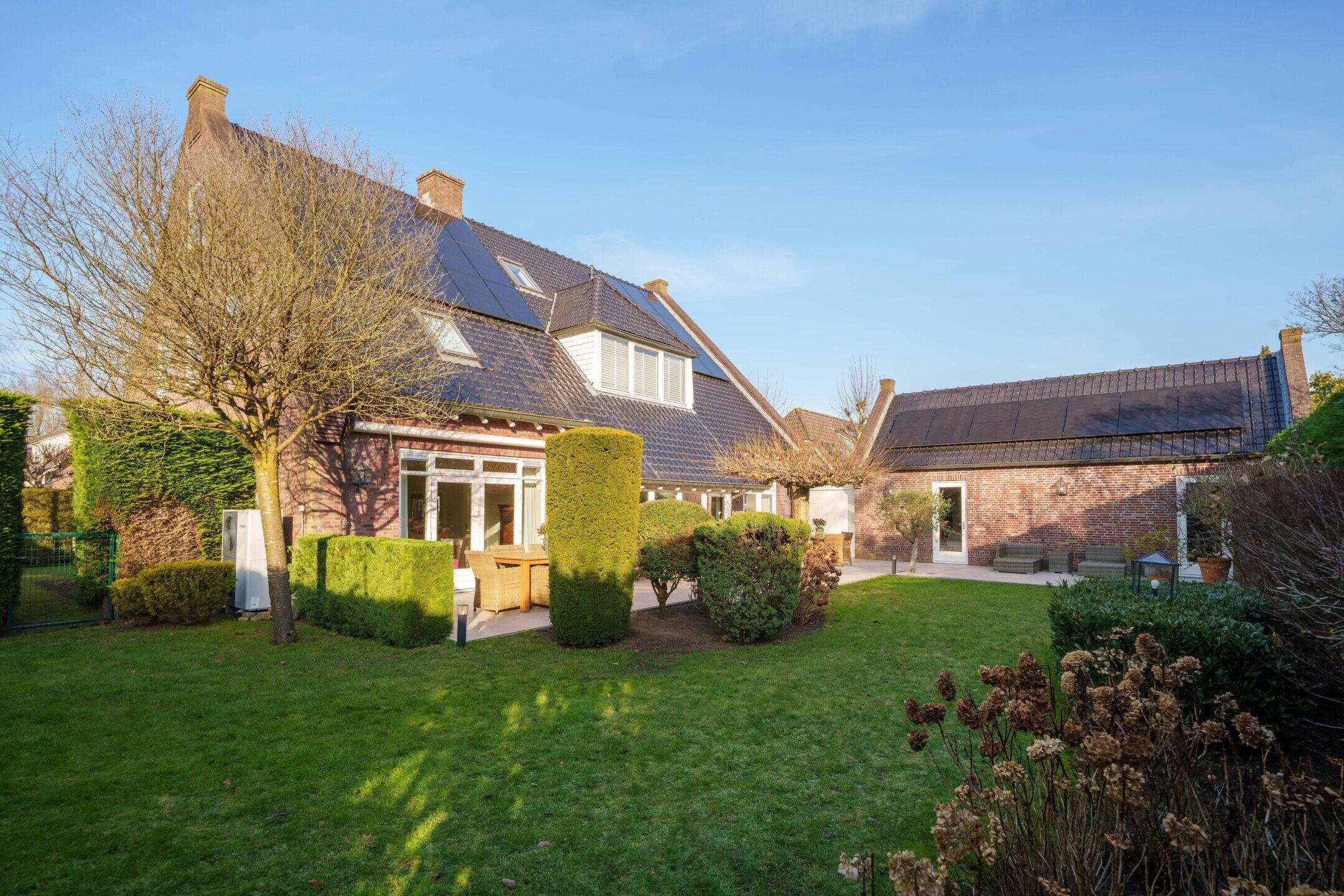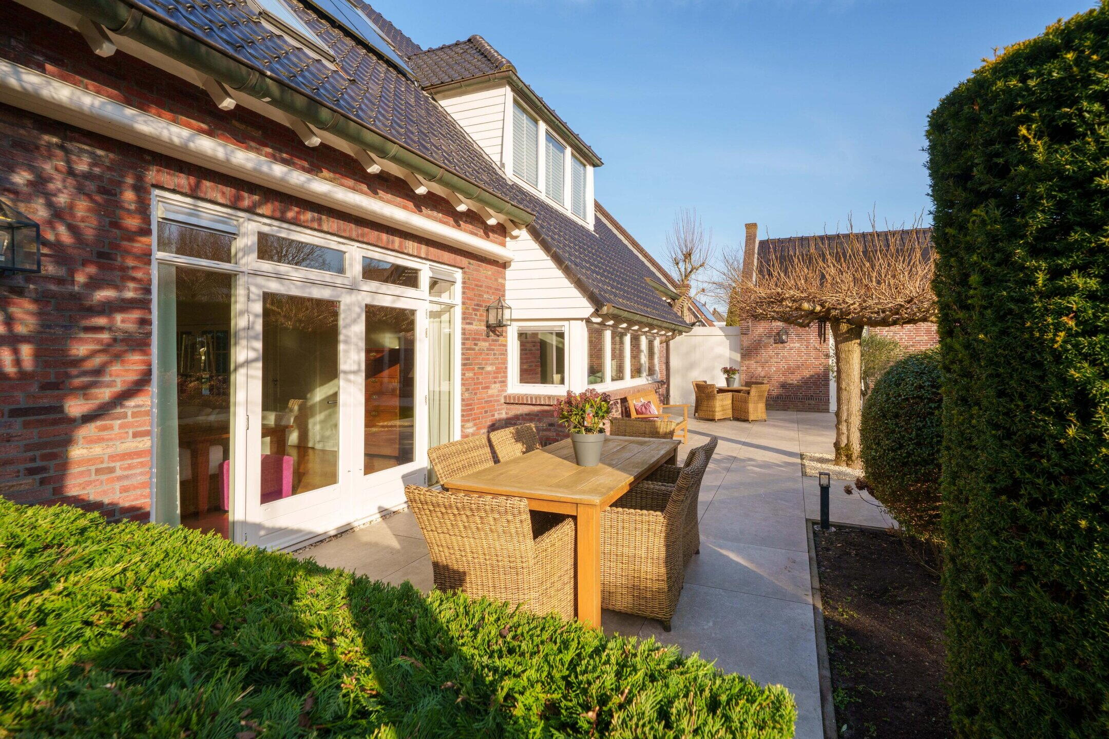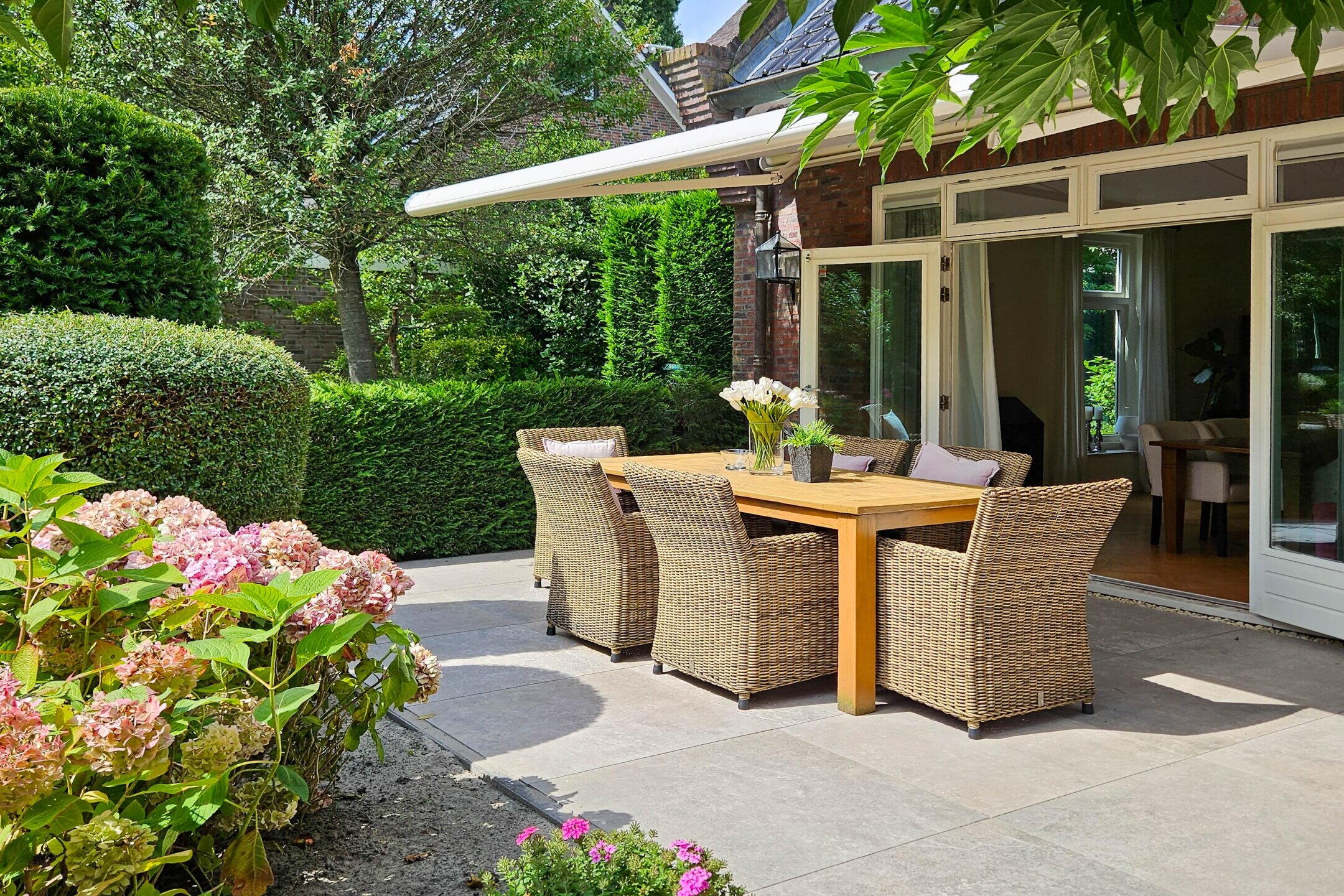 De tuin is rondom de woning gelegen en fraai aangelegd met veel groen, volwassen beplanting, tuinverlichting, beregeningssysteem en meerdere terrassen. Het hoofdterras is in 2023 vernieuwd en ligt gunstig ten opzichte van de zon. Zonneschermen zorgen voor extra comfort tijdens warme dagen. Een heerlijke buitenruimte met optimale privacy en vrijwel de hele dag zon.